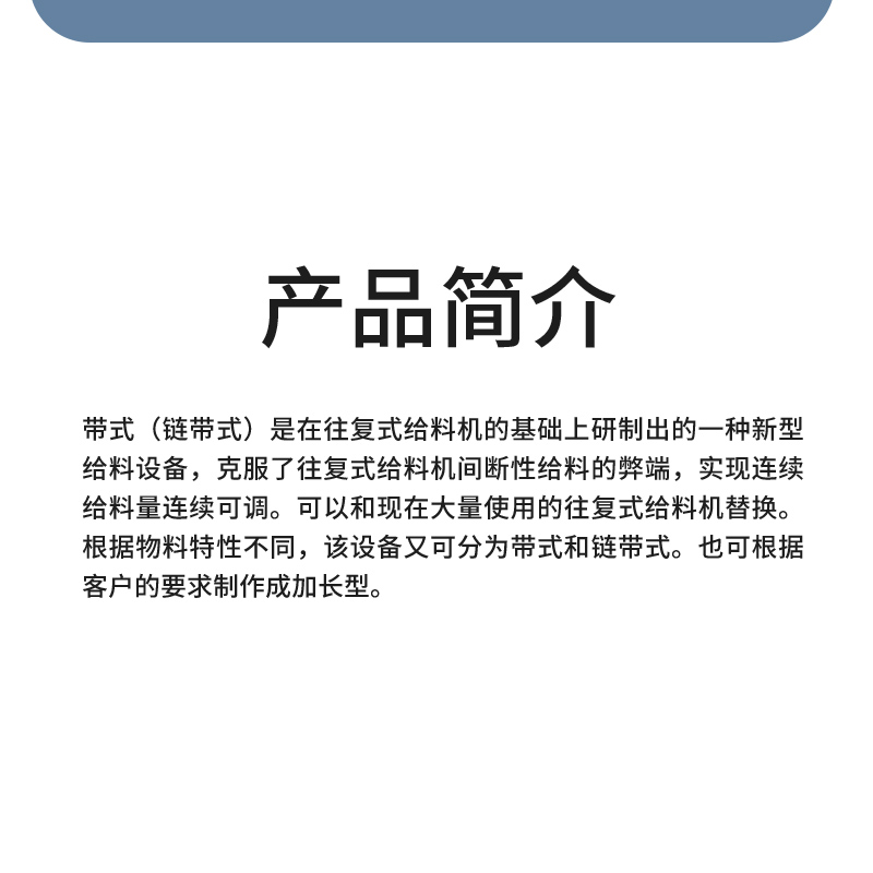 带式(链带式)是在往复式给料机的基础上研制出的一种新型给料设备,克服了往复式给料机间断性给料的弊端,实现连续给料量连续可调。可以和现在大量使用的往复式给料机替换。根据物料特性不同,该设备又可分为带式和链带式。也可根据客户的要求制作成加长型。