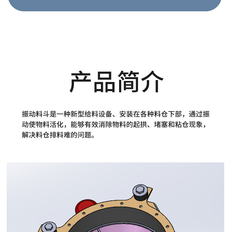 振动料斗是一种新型给料设备、安装在各种料仓下部,通过振动使物料活化,能够有效消除物料的起拱、堵塞和粘仓现象,解决料仓排料难的问题。